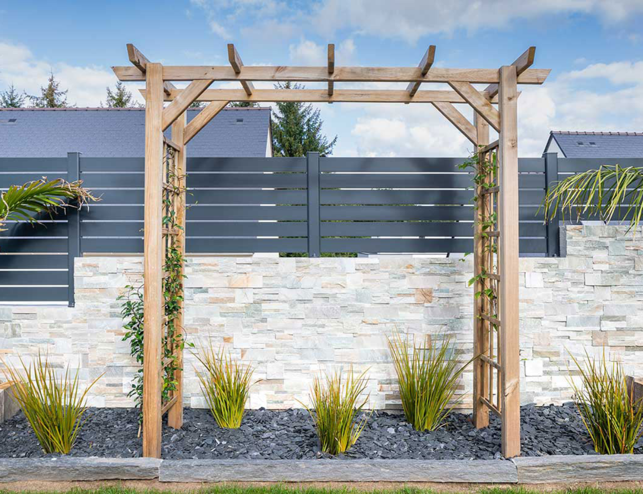 Simple ligne aérienne, forteresse hermétique ou élément ultra graphique, la clôture délimite et sécurise votre extérieur. Il y en a pour tous les goûts : panneaux pleins, ajourés, avec inserts, barreaux, lames brise-vue …